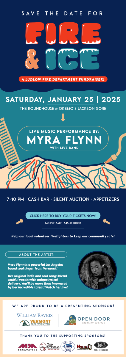 Join us for the 2nd Annual Fire & Ice Fundraiser on Saturday, January 25th, 2025 for a night of live music with The Myra Flynn Band! All proceeds are donated to the Ludlow Fire Department. The event will again be held at The Roundhouse at Jackson Gore from 7PM to 10PM.